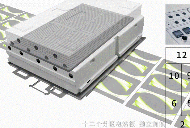 - 十二个区电热板,配有定时启动温控器功能,每区温度可单独控制调节;